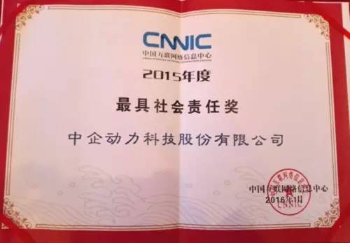 1月20日,2016年度中国域名行业年会暨2016年度CNNIC(国互联网络信息中心)合作伙伴大会在广州召开,中企动力被评为“2015年度五星级注册服务机构”,这也是CNNIC自2008年对域名地址服务机构评定“星级”以来,中企动力第8次获评。同时,在此次年会上,CNNIC将行业内唯一一个最具社会责任奖颁发给了中企动力。